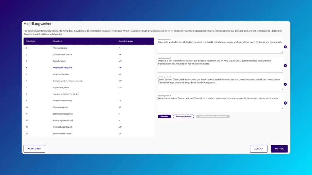 KODE® Feedback ermöglicht dir, ein Soll‒Profil aus unternehmensrelevanten Kompetenzen für jede Positionen zu entwickeln. Dadurch erhalten Feedbackgebende die Chance, klare, zielgerichtete Rückmeldung zu geben und Feedbacknehmende die volle Transparenz, welche Kompetenzen für ihre Rolle entscheidend sind.