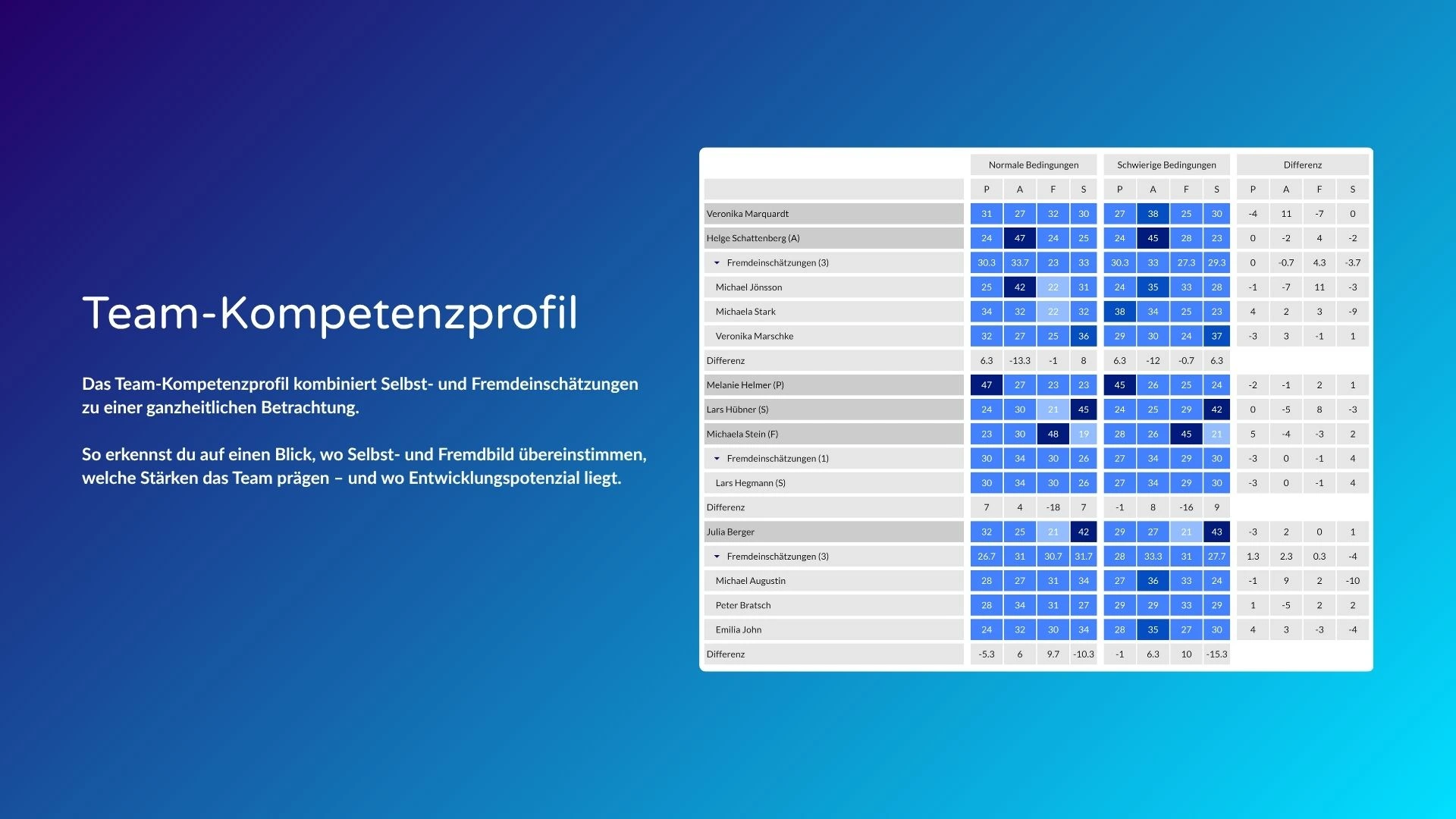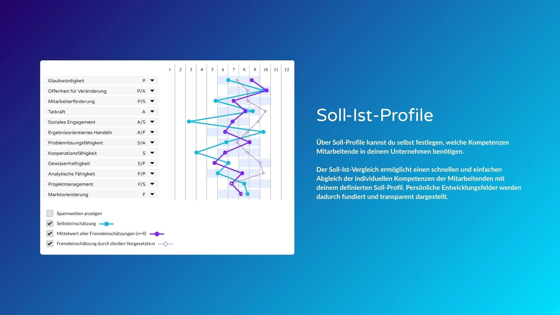 - einen Soll-Ist-Abgleich, der individuelle Stärken und Entwicklungsfelder sichtbar macht