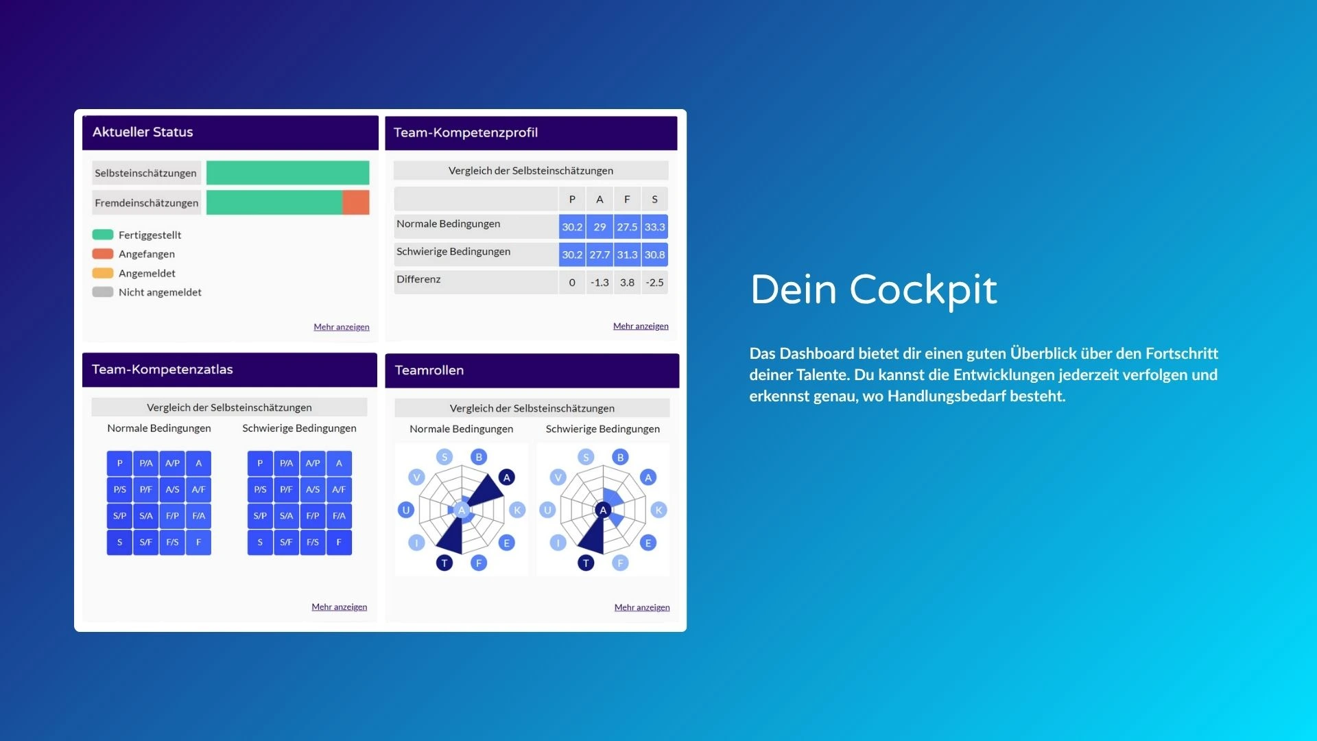 Das Ergebnis: ein individuelles Kompetenzprofil, das Stärken sichtbar macht, Entwicklungsfelder aufzeigt und den Soll-Ist-Abgleich mit den Kompetenzanforderungen deiner Organisation ermöglicht.